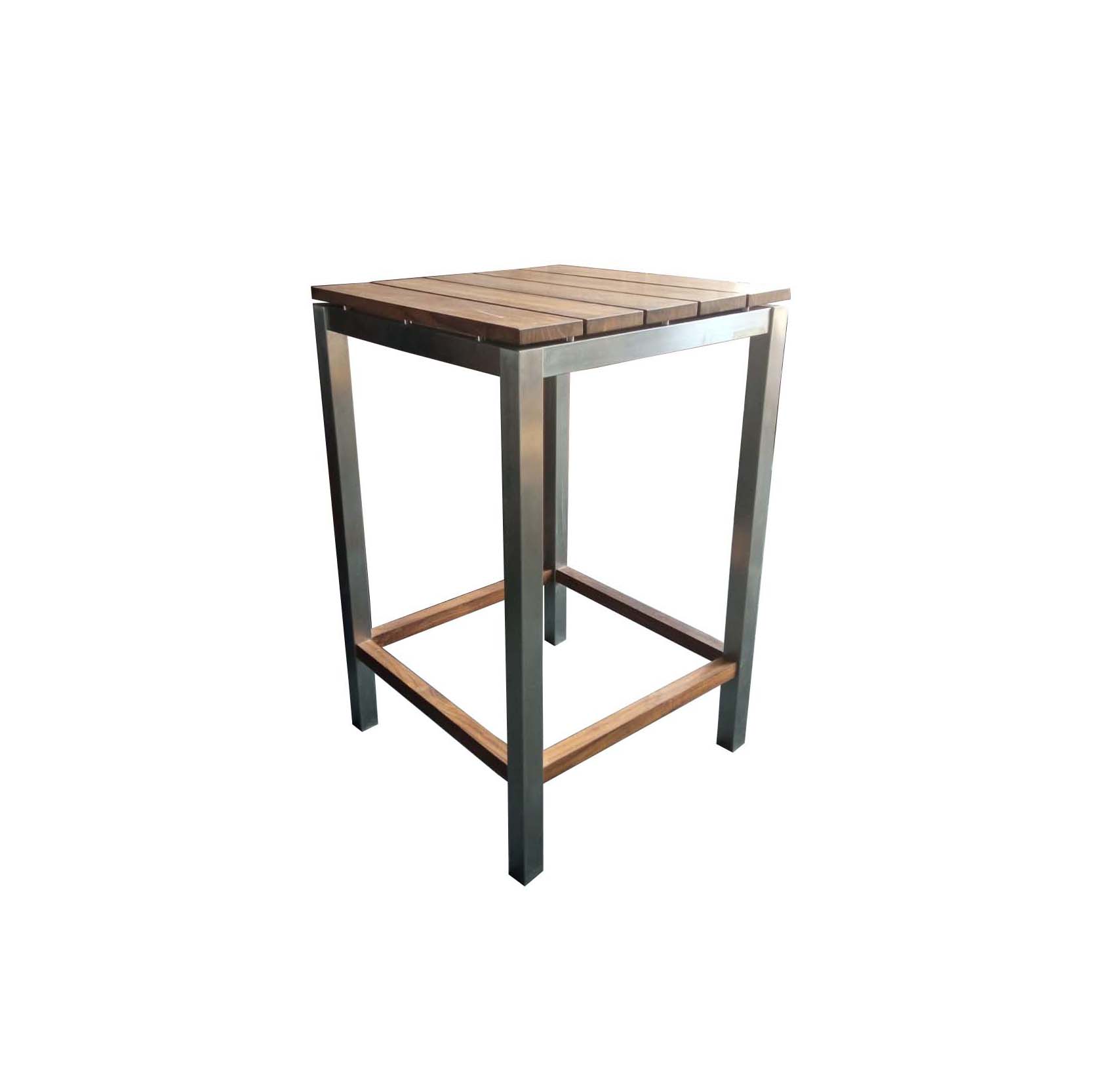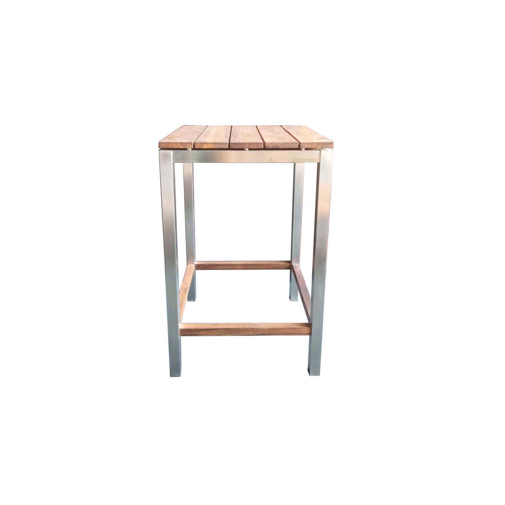 Meja bar dengan material kayu jati di bagian top, kaki dari stainless steel.