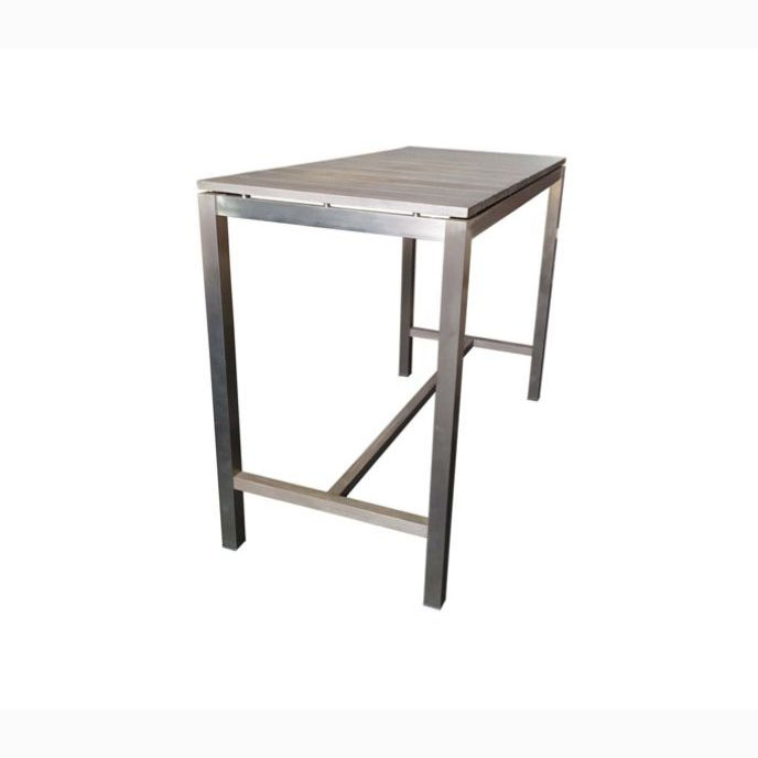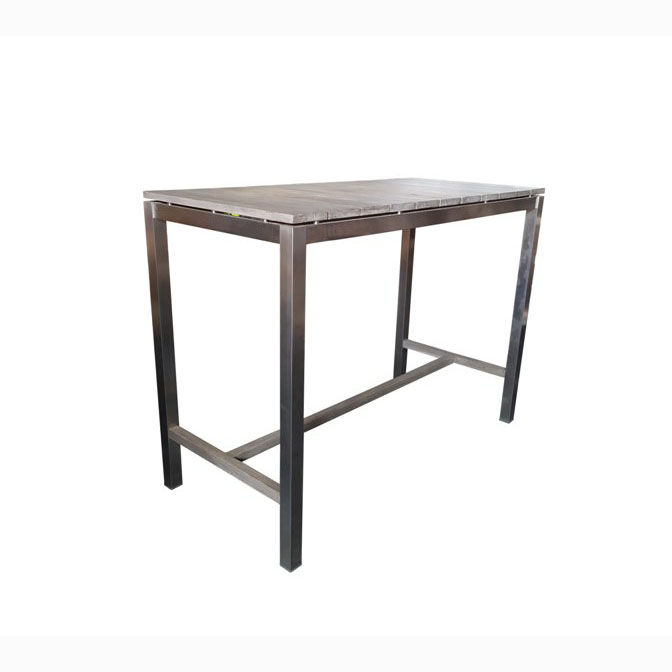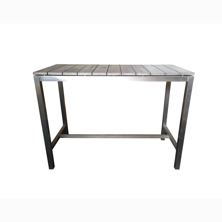 Bar table / meja bar dari material kayu jati solid (top) dan stainless steel (kaki).